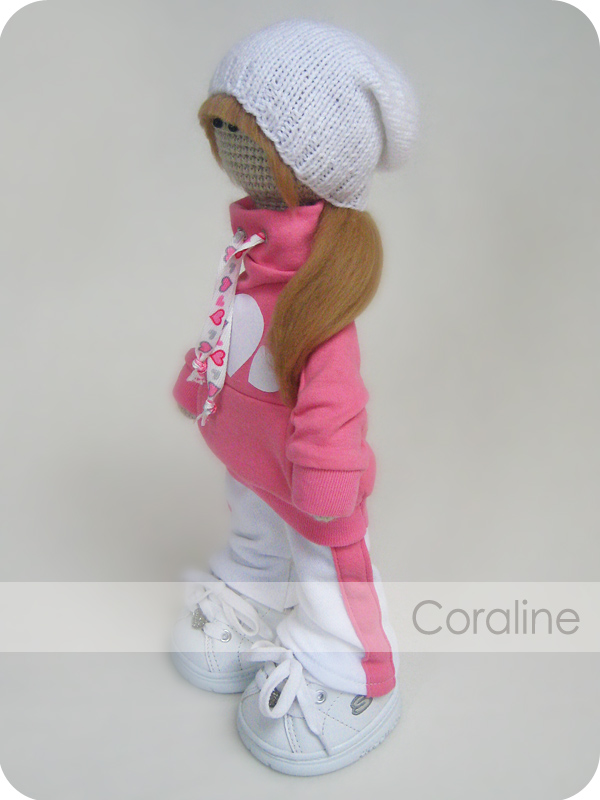 Andie ma 41 cm wzrostu, bawełniany dresik, czapkę robioną na drutach i gotowe buciki. Włosy z czesanki.